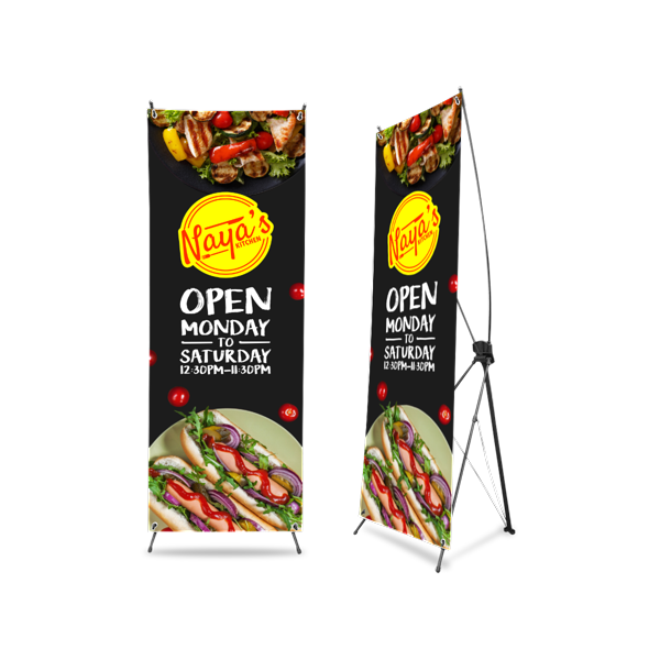 Order your X-frame stand with a custom banner emphasizing a new product, service, or promotional sale